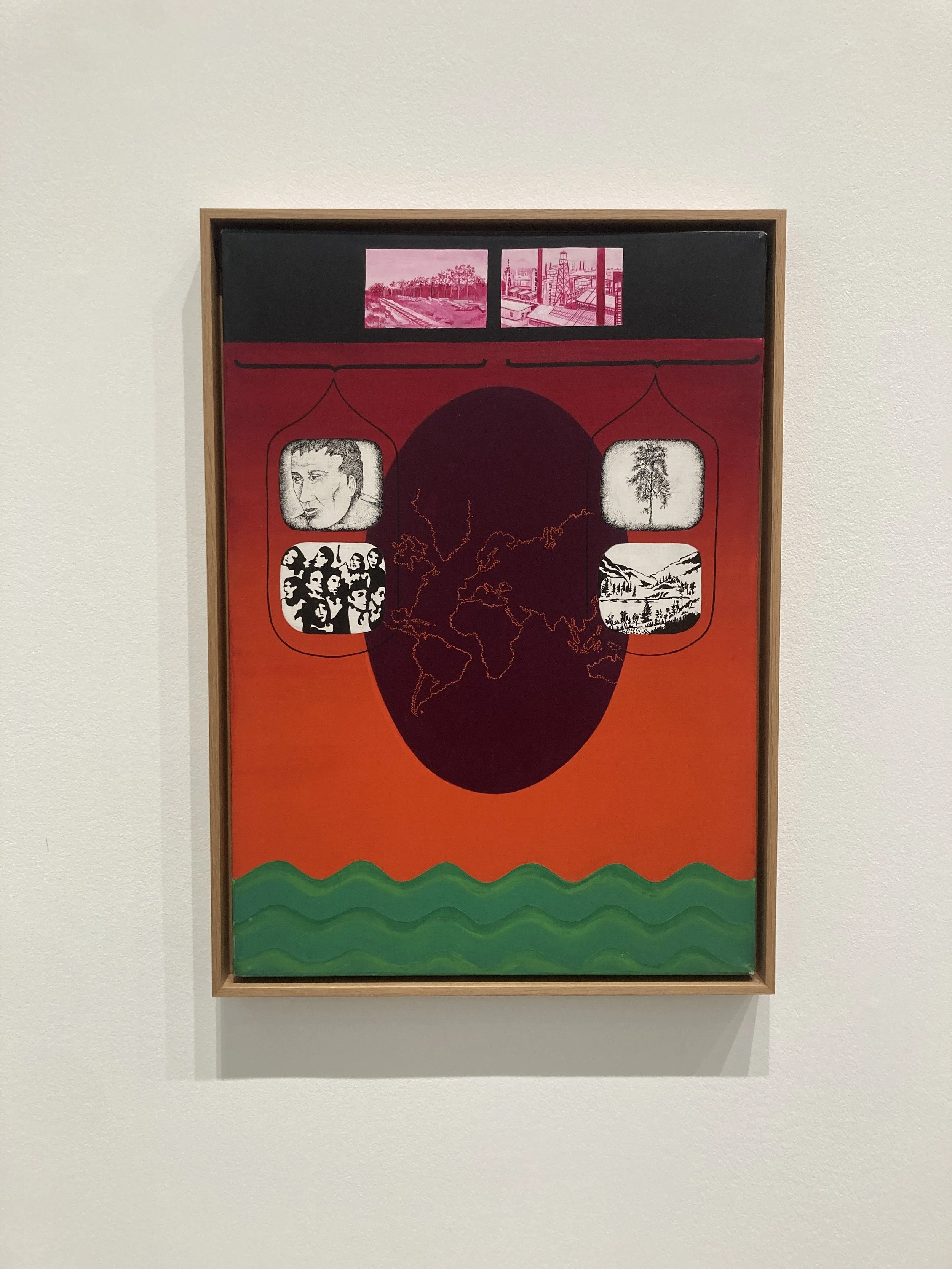 Many of her later works including Geohistoriografía Relevamientos y Sueños de América from 1975 investigate these relationships through representations of the borders themselves–removed from their context. This work in particular . leans heavily on the central depictions of the American continents borders, framed by ovals seen commonly in her early abstract investigations. Below the ovals sit a multitude of symbols of protest and resistance, backed by images of work and industry.