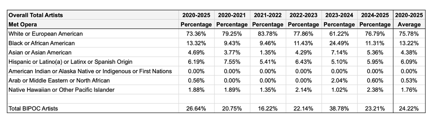 These findings point to growth in BIPOC artists onstage for most groups in leading roles in 2020-2025 especially Black and African American artists at the Met Opera and with the exception of the group of American Indian, Alaska Native, Indigenous, and First Nation individuals with zero instances of casting; however, what progress has been made in closing the gap between White and BIPOC groups since 2020-2021, White artists have increased exponentially in the latest 2024-2025 season, creating a large divide in diversity once again with 75% of leading roles cast identifying as White or European American.