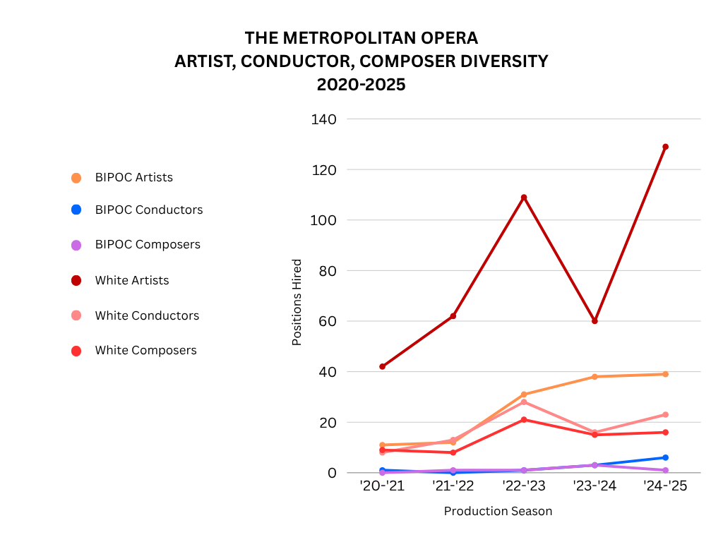In Figure 3, further confirmation is shown in the number of positions hired through 2020-2025 and the large gap in White individuals onstage and in stories at the Met Opera.