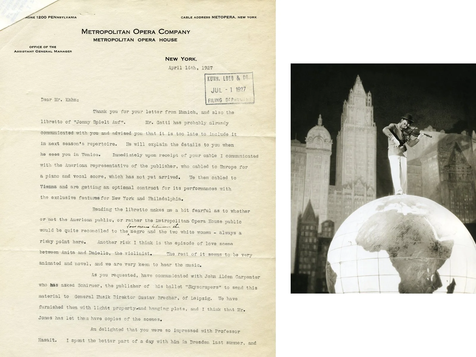 Met assistant manager Edward Ziegler identified interracial romance as a potential “risky point” with the Metropolitan’s public in 1927. (Otto H. Kahn Papers, Princeton University Library)