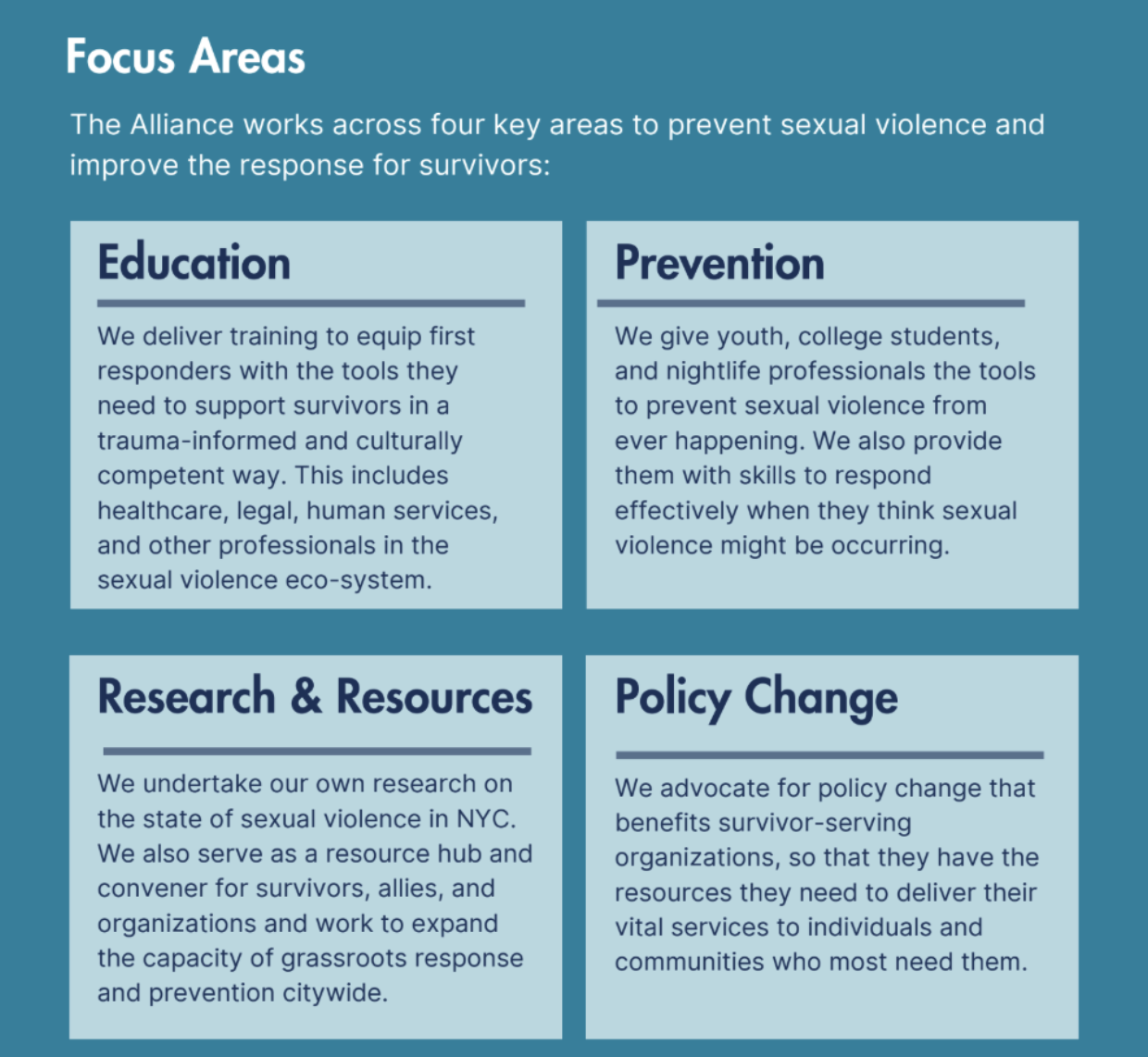 The Alliance leads New York City’s mission to end sexual violence through education, prevention programming, research, and advocacy for policy change. They pursue their mission by centering those most impacted by sexual violence, working through an anti-oppressive and trauma-informed approach. They center those who are historically underserved, including BIPOC, immigrant, LGBTQ+ communities, and low-income communities. The Alliance was founded in 1999 by a coalition of rape crisis programs. They continue to be the only organization leading a coordinated response to sexual violence in NYC.